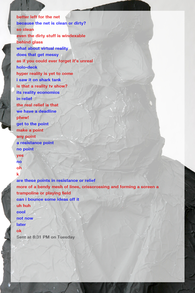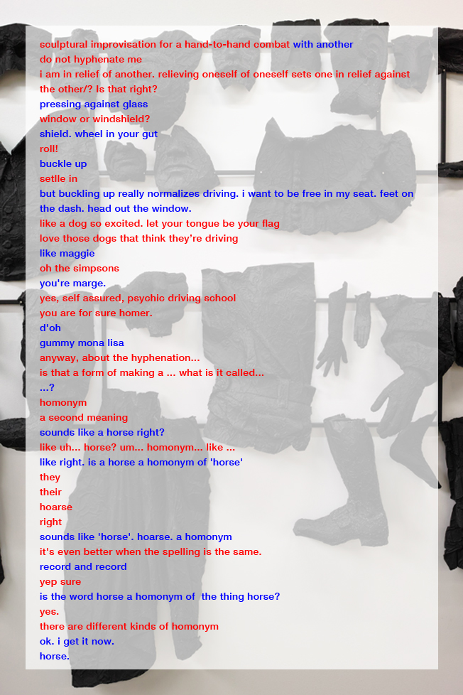 M: We realized when we were writing our Masters that through working together we’ve always, I guess we’ve been able to be together for so long, because we don’t assume to know each other. We don’t think you can know each other really directly. We can know each other through interactions and traces and the process of our making is a really good example of it where one of us might put something forward, the other will make some kind of alteration and its in the alteration, seeing what you’re doing, and knowing what you’re thinking behind the object and seeing it altered that you get a sense of how the other person is thinking. In a way we’re returning to this absence presence that you had asked about, defiguring something to refigure it. I have a sense of Hadley when she alters something that I’ve done and then of course we have the new changed figure. I make a change and she makes a change, and so we keep sensing each other in these alterations. We call it pressings against a… What’s the durometer of sense? We have these really weird terms for it, but my god your right…