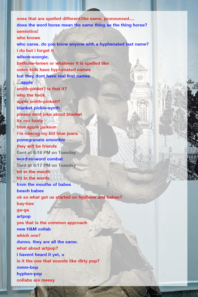 H:The splice, or the space between the cuts like the jump cut. It’s funny because we’ve been thinking about our practice in terms of collage, and especially recently with our interest in cubism. I’m trying to think of what is the difference between montage and collage and maybe it’s that montage is considered a kind of linear collage. It’s time based and I think we still want to include this element of time, but to try to figure out a way to manifest it. Not necessarily in a linear sense or one thing following another, but in a way of overlapping where in the role of editor the viewer senses themselves discerning things and picking things out and pushing things away. We’d like for the kind of volume of impulses or input to be determined by the perceiver rather than ourselves. With 1+1-1 we did think about it as kind of a resistance to the auteur, to the great Godard, seeing what would happen if you dispersed that over a collaboration, but also to include the audience as a kind of collaborative force. I guess that it occurred to me going through our projects, that there is always this desire to set up a kind of ambivalence within the dialectic. We choose two poles and try to charge the magnets of those poles, so that you’re being shifted back and forth between them. I don’t think that’s necessarily a montage format, because you can go back in time, whereas with film, you’re in that scene and you’re propelled forward…